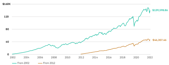 Also starting off with $500 and making ongoing investments of the same amount, the investment balance would have reached just over $46,000 by mid-2022.
